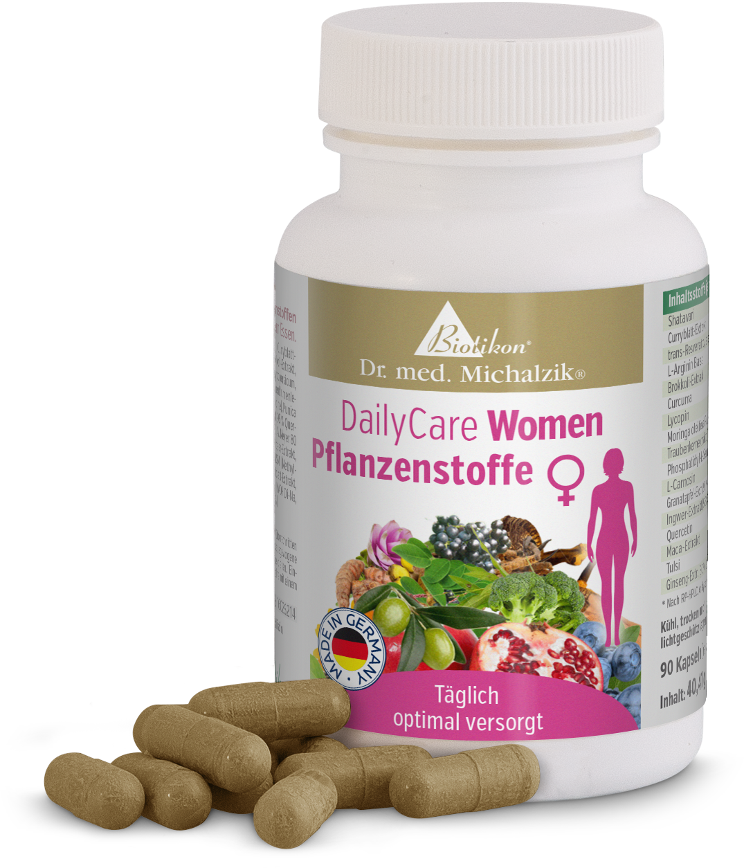 ![]() Alle wichtigen bioaktiven Pflanzenstoffe für die Frau ab 50… Produkt-Details (1.339,02 €/kg, 0,61 €/Kapsel) 90 Kapseln (1.339,02 €/kg, 0,61 €/Kapsel) 54,90 € | DailyCare Women 50+ Pflanzenstoffe | 54,90 € (1.339,02 €/kg, 0,61 €/Kapsel) | Alle wichtigen bioaktiven Pflanzenstoffe für die Frau ab 50; Tagesempfehlung: 3 Kapseln. | 90 Kapseln |